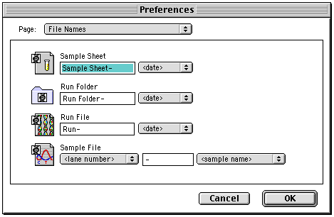All 3100, 3700, and 3730 Capillary sequencers use the underscore as the field delimiter for text and chromatogram files. dnaLIMS parses the file names with the underscore to identify the Well Plate Coordinate. Please retain the underscore as the field delimiter. Using underscores within sample and primer names throws off the parsing algorythm. Do Not use the underscore in sample or primer names. The 377 sequencer requires other modifications that are listed below. Modifying ABI 377 Data Collection File Name Delimiter Within the Run Folder, it is Required to use a Hyphen as the separation delimiter. Use the Hyphen to separate the Lane Number AND the "Sample Name Primer Name" fields of the sequence and trace files. The default file delimiter is typically a large black dot. Use the following procedure to change the large black dot to a hyphen. |
